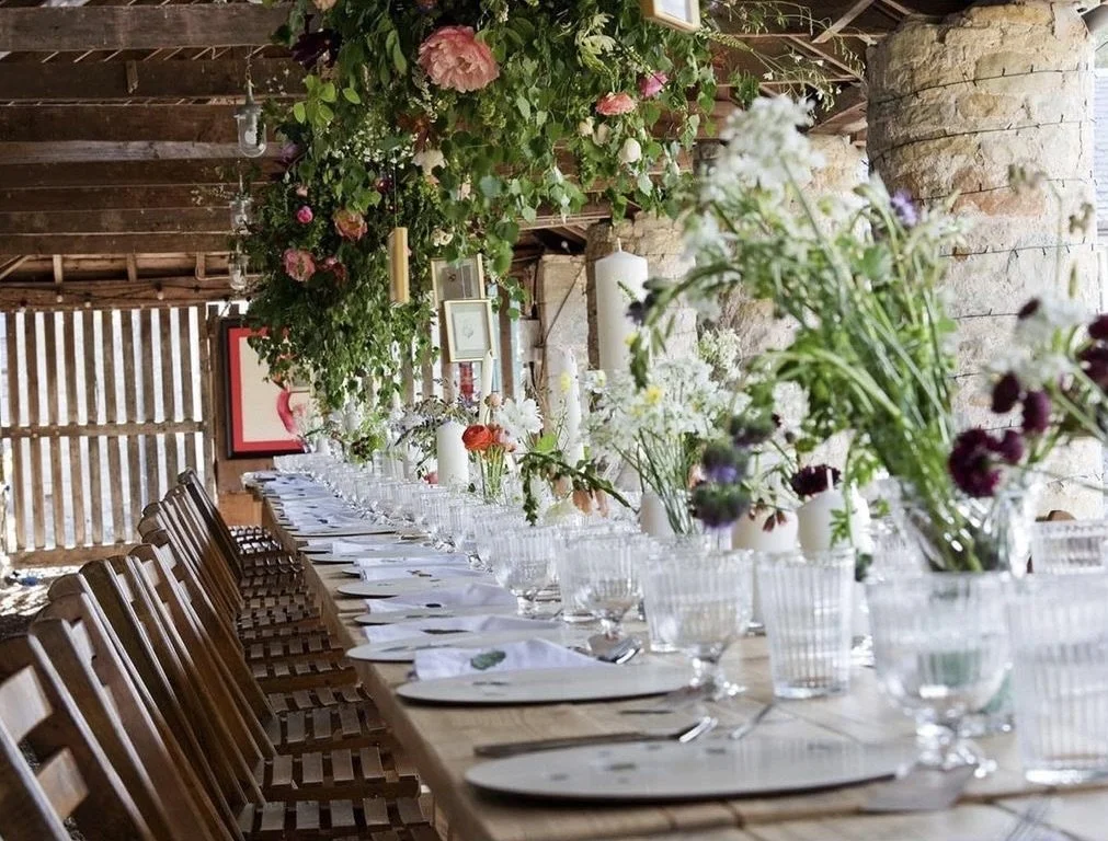 We created three large hanging globes of flowers, these hung at intervals from the barn beams and created the effect of naturally spilling onto the long table as foliage tumbled down. The flowers were a real celebration of early June as irises, ranunculus and aquilegia featured. However the show was stolen by the Coral Charm peonies that flowered perfectly on time for the event. Along the centre of the table bud vases of varying designs and heights were filled with delicate blooms and interspersed with candles. The overall effect was one of a summer’s abundant meadow, rich and vital, and overflowing with growth and freshness.